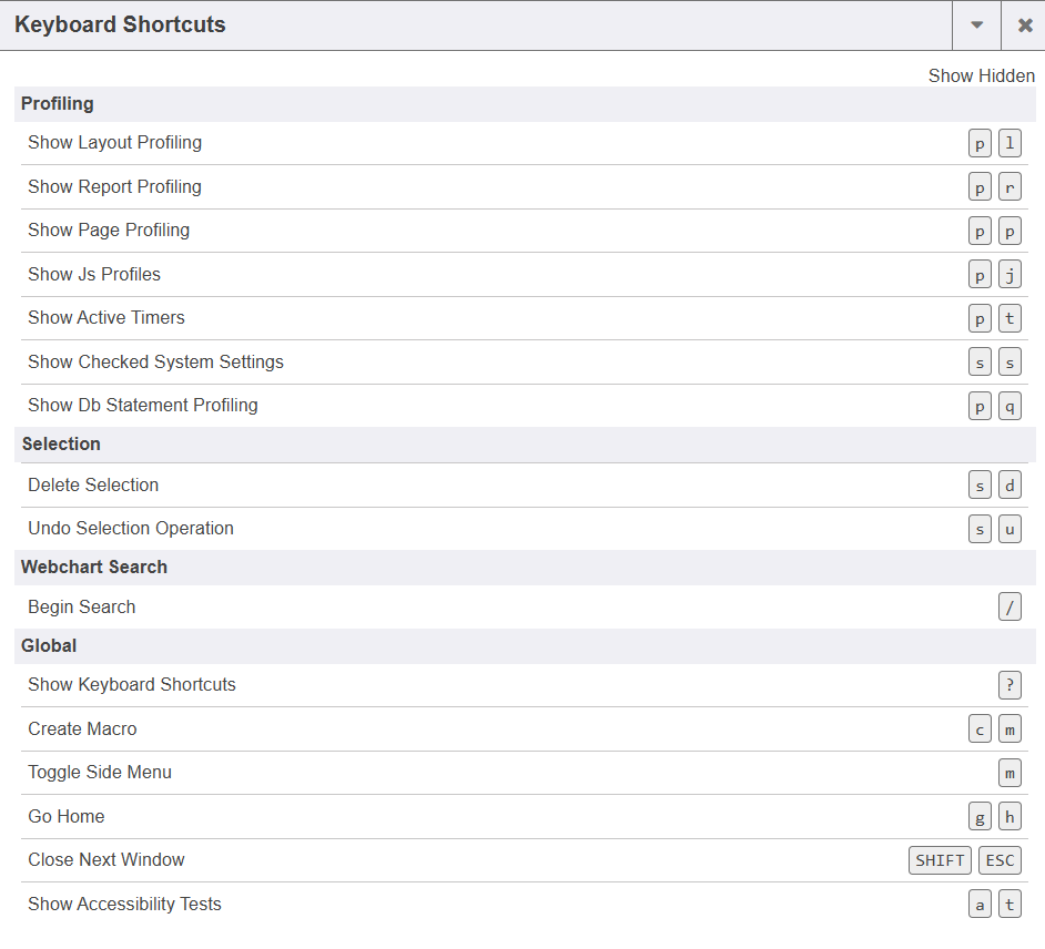 - The Keyboard icon displays a list of Keyboard shortcuts.